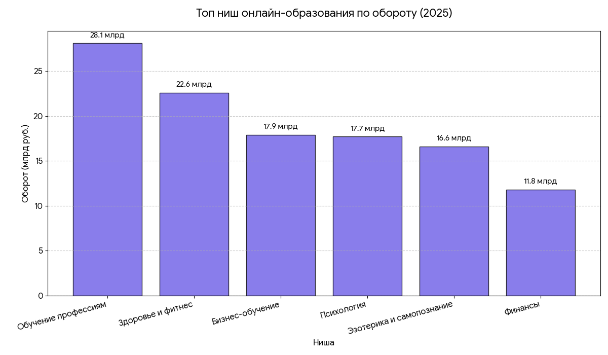 1.Обучение профессиям - 28,1 млрд руб. Сюда входят курсы по дизайну, маркетингу (SMM), IT и повышению квалификации. Рынок голосует рублем за возможность сменить работу или вырасти в карьере.