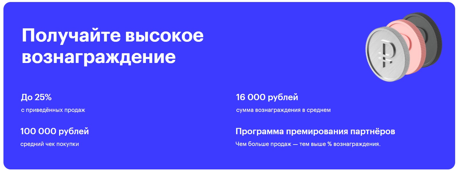 Крупнейшая образовательная платформа, у которой тоже есть реферальная программа для веб-мастеров и блогеров. Партнёрам платят от 5 000 ₽ за каждую продажу курса, а при больших объёмах комиссия может достигать 25–28%. В 2024 году партнёры Skillbox в сумме заработали более 215 миллионов рублей, а топовый партнёр получил свыше 15 млн ₽ вознаграждения за год. Цифры впечатляют, хотя понятно, что таких результатов достигают немногие, это демонстрирует потенциал заработка на партнёрках. Skillbox, как и многие другие онлайн-школы (GeekBrains, Нетология и др.), рады сотрудничать с теми, кто приводит новых студентов. Даже если у вас нет собственного блога с тысячами подписчиков, можно порекомендовать курсы знакомым или в профессиональных сообществах, вдруг кто-то как раз ищет обучение, а вы и поможете советом, и немного заработаете.