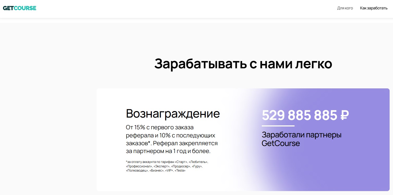 Крупнейшая платформа для онлайн-школ, на которой работают многие эксперты. Имеет партнёрскую программу для привлечения новых школ на платформу. Вознаграждение составляет около 20% от прибыли самой платформы с оборота подключенной онлайн-школы. Фактически вы получаете долю с продаж курса/школы, проходящих через GetCourse, в течение ограниченного срока (до 2 лет, в зависимости от статуса партнёра). Несмотря на отсутствие пожизненного закрепления, ставки тут щедрые, учитывая обороты крупных школ.
