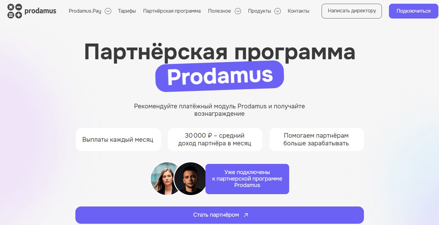 Платёжный модуль, популярный среди онлайн-курсов. Отличается многоуровневой партнёркой. За подключение нового клиента платят единоразово около 4000 ₽, плюс идёт ежемесячно 20% от прибыли компании с оборота клиента (пожизненно). По оценкам, это выходит ~ 4000 ₽ ежемесячно с каждого миллиона оборота клиента. Дополнительно на третьем уровне можно получать 5% с продаж, совершённых клиентами ваших клиентов, своего рода реферальная сеть. Таким образом, Prodamus мотивирует технаря не только приводить школы, но и привлекать коллег к партнёрству.