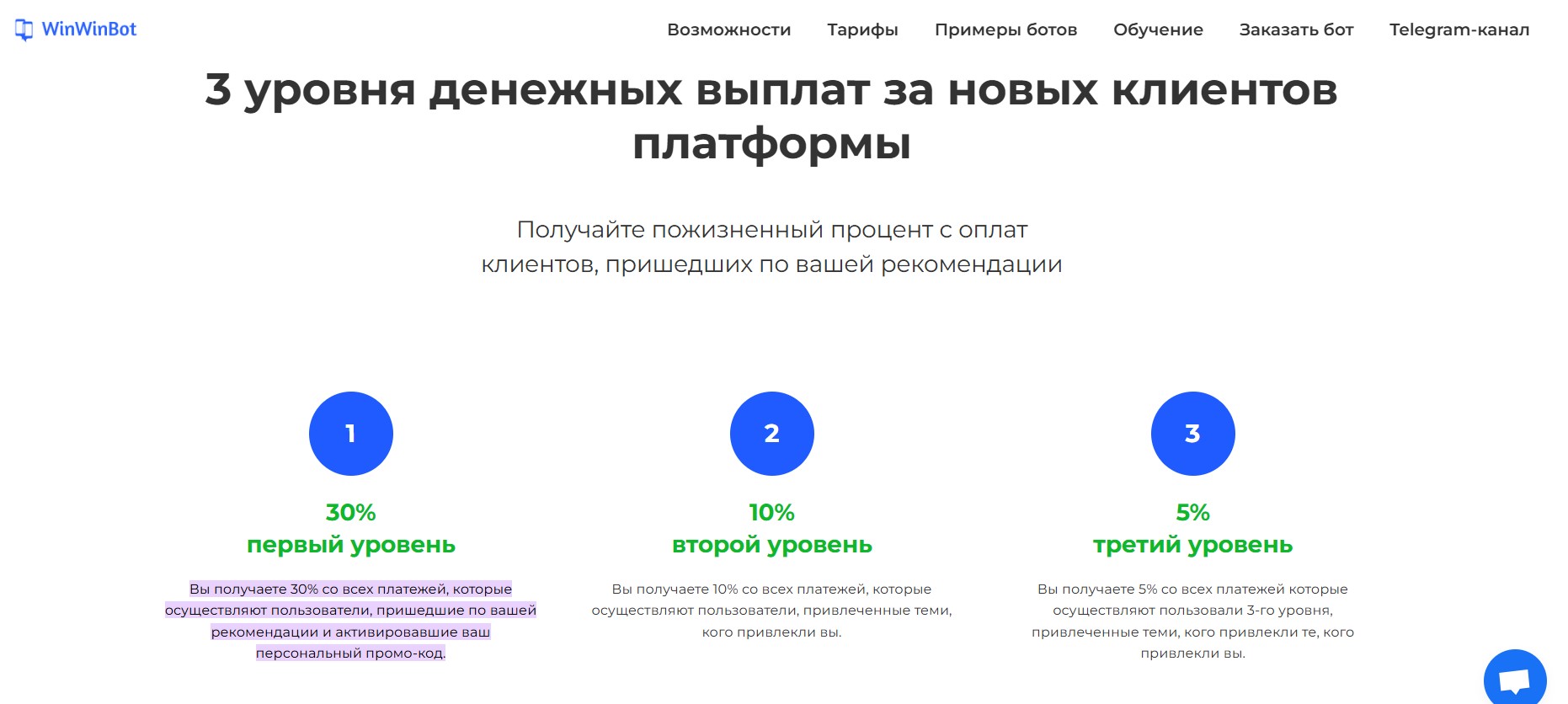 Сервис для автоматизации в мессенджерах (например, чат-бот для WhatsApp и интеграций с LMS). Предлагает партнёрам 30% комиссию с платежей привлечённых пользователей. Приятный бонус – клиенту при регистрации через партнёра даётся скидка 10%. Высокий процент вознаграждения (30%) делает WinWinBot весьма привлекательной рефералкой, особенно если у вас много клиентов, желающих внедрить чат-ботов или авторассылки.