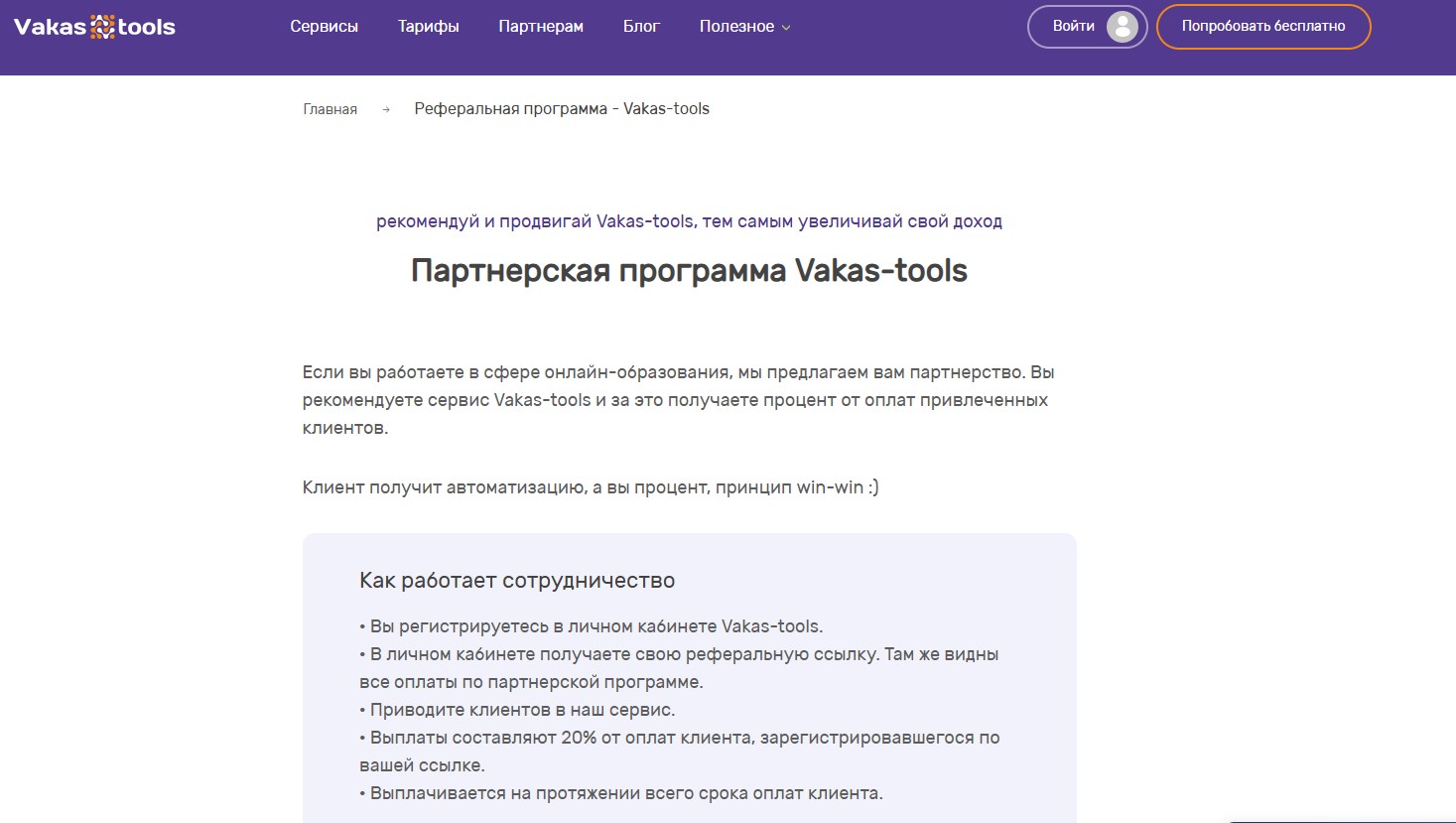 Специализированный сервис для интеграции и автоматизации процессов в онлайн-школах. Идеален для техспециалистов: позволяет связать сайт, CRM, рассылки, вебинары и другие инструменты в единую систему. Партнёрская программа Vakas-tools предлагает 20% от всех платежей привлечённого клиента на протяжении всего срока его работы с сервисом. Клиент получает удобную автоматизацию, а вы – стабильный процент, классический принцип «win-win». Как отмечают сами технарии, Vakas-tools буквально создан, чтобы облегчить нашу работу, многие рутинные задачи автоматизируются, что демонстрирует вашим клиентам ваш высокий профессионализм. Зарегистрируйтесь и попробуйте всё сами, подробности о возможностях здесь. А привлекать пользователей оказывается просто: вы делитесь своим опытом, показываете, как автоматизация экономит время и ресурсы, помогаете внедрить инструмент и в награду получаете свою комиссию. Причём это не разовый заработок: “за каждую оплату клиентов я получаю 20%, и пока они пользуются Vakas-tools, я продолжаю зарабатывать”. Такая партнёрка уже многим техспециалистам дала ощутимый дополнительный доход без лишних движений.