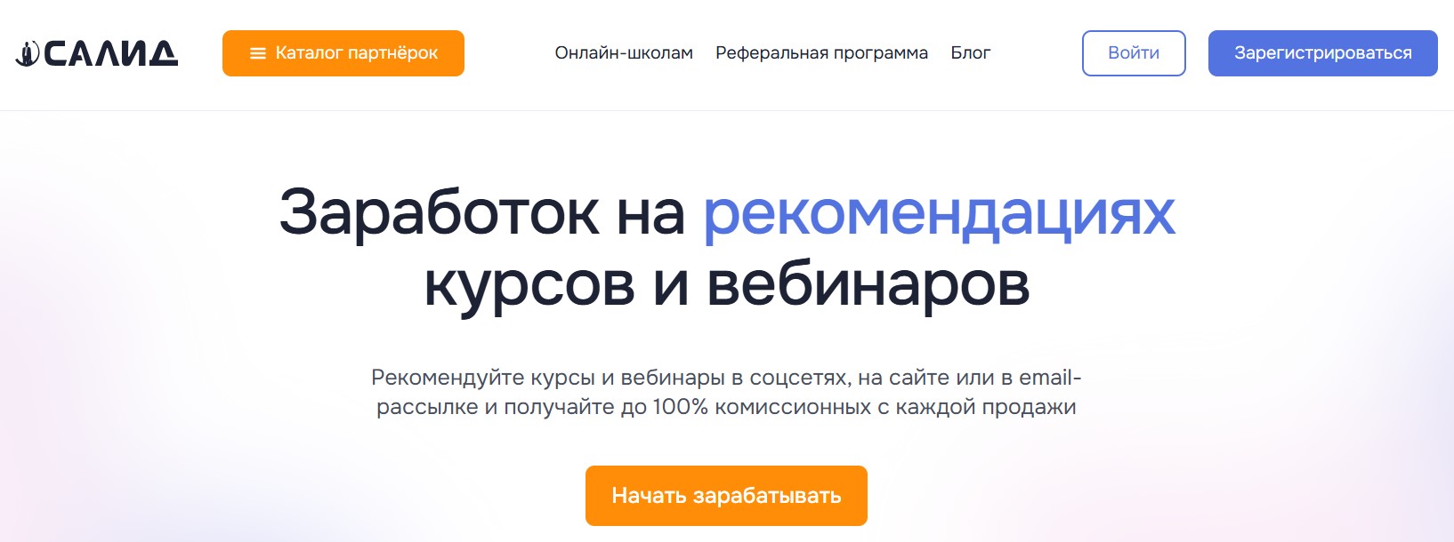 Это уже целая партнёрская сеть №1 в сфере онлайн-образования, объединяющая сотни инфопродуктов и курсов. Интересна тем, кто готов рекомендовать образовательные программы массовой аудитории (например, через блог, телеграм-канал или рассылку). Комиссии в SALID – до 100% от стоимости курса! Да-да, некоторые авторы готовы отдавать партнёрам всю сумму продажи. В среднем же вознаграждение составляет 30–40%, что тоже очень много. Почему так щедро? Всё просто: инфопродукты имеют огромную маржинальность, и онлайн-школы готовы делиться большим процентом, особенно когда партнёр приводит “тёплых” клиентов, скажем, на вебинар.