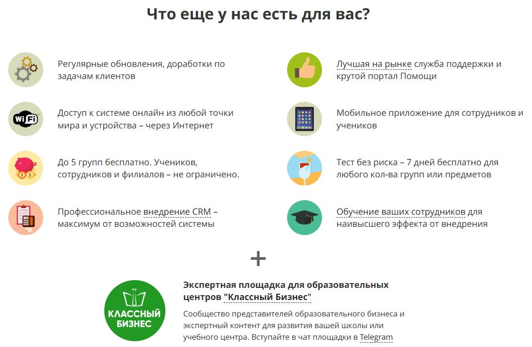 CRM, виджеты и личные кабинеты. Оповещения, рассылки, чаты Telegram и WhatsApp. Онлайн-расписание для сайта и ВКонтакте. Интеграции (банки, мессенджеры, телефония и др.). Неограниченное количество учеников, филиалов и аудиторий. |