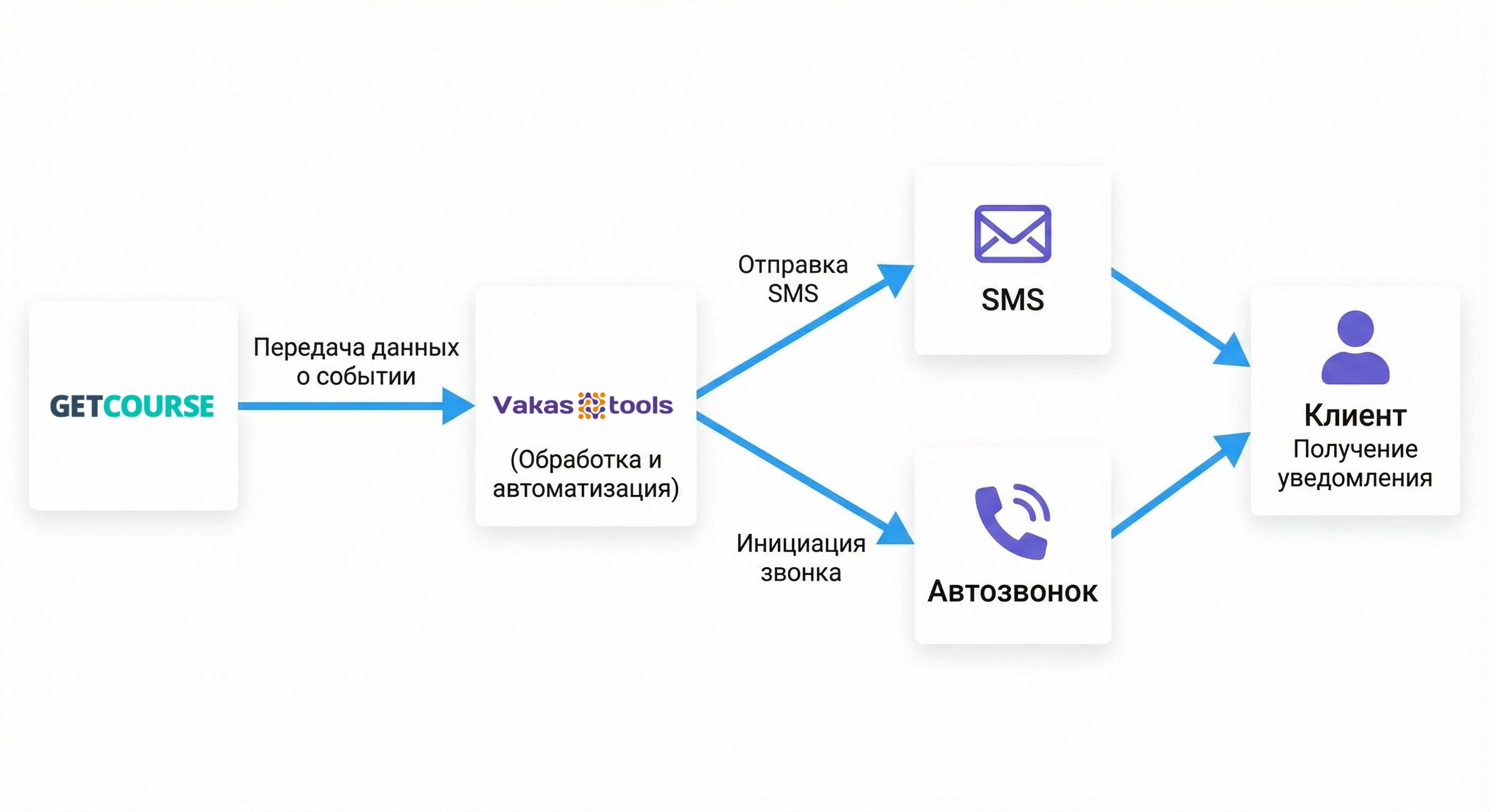 Когда событие срабатывает, Vakas-tools автоматически: отправляет SMS или запускает автодозвон, который мотивирует вернуться к обучению.