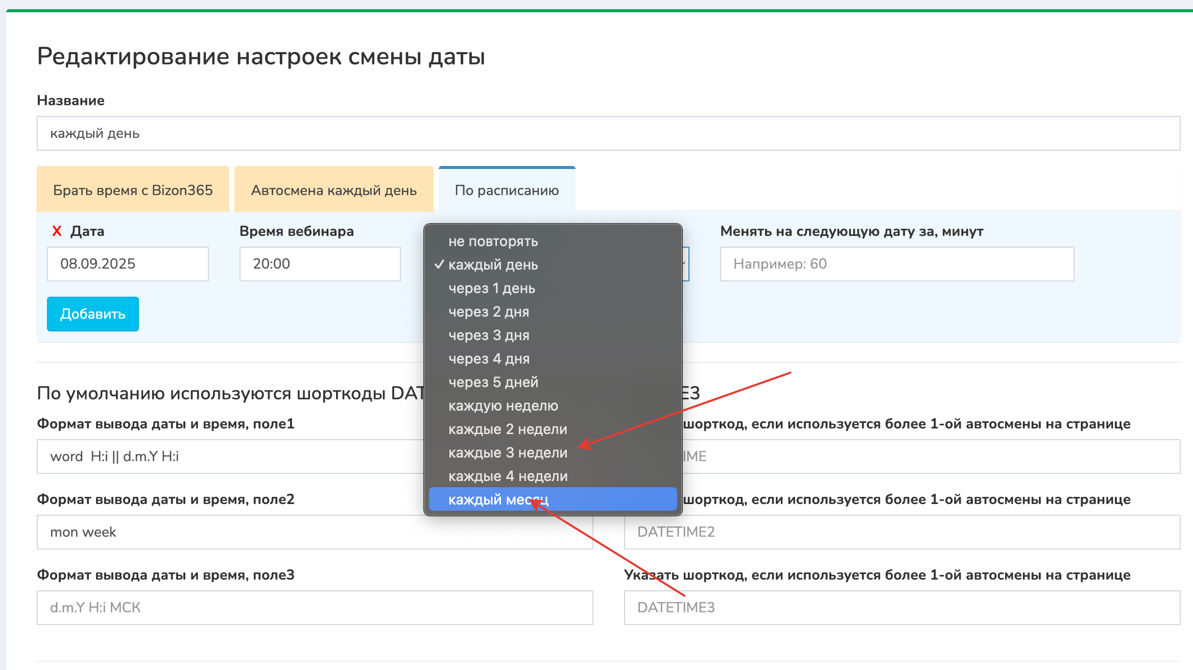 7. Также можно указать время, за сколько времени прекращать регистрации на текущий вебинар и регистрировать уже на следующий вебинар. Это настраивается в поле «Менять на следующую за, минут». Т.е. в поле вы прописываете за сколько минут до текущего времени сменять дату. Например вебинар у вас в 15:00, в поле вы указали 60 минут, значит после 14:00 будет показываться дата будущего вебинара.