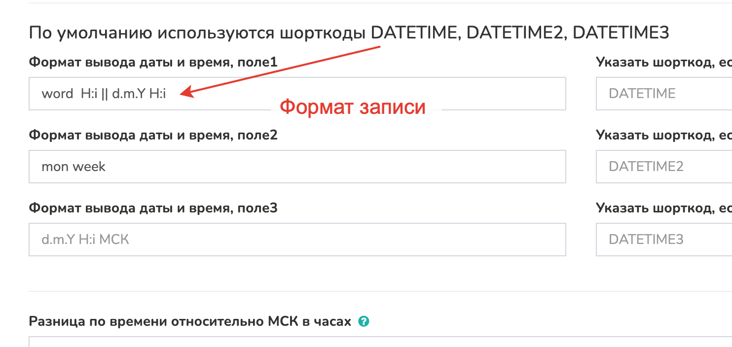 8. Заполняете формат даты, так, как нужно вам. Почему три поля, потому что у вас может быть несколько видов даты на лендинге. Например в одном месте указана только дата, в другом месте указана дата и время.