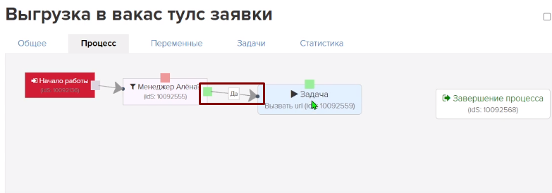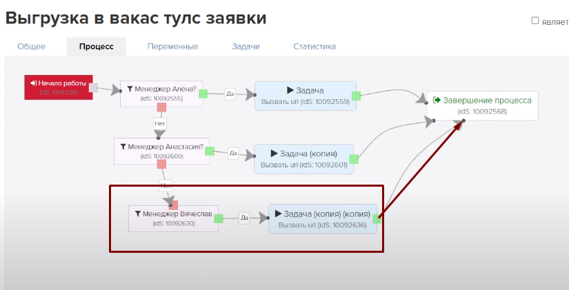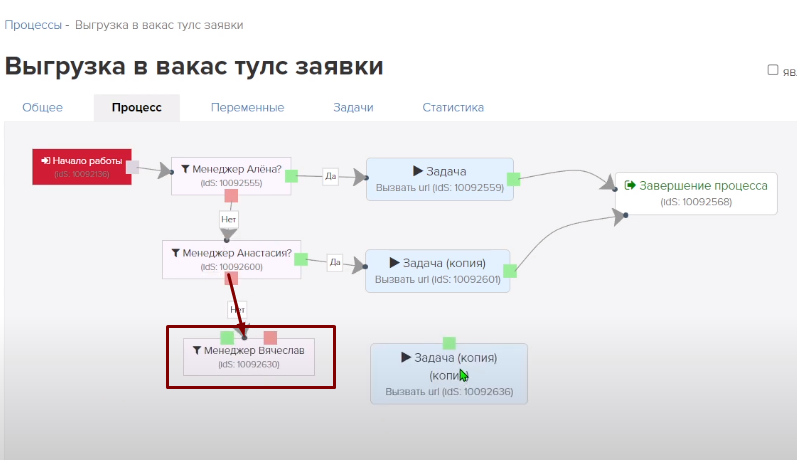 Далее проверяете, является ли менеджером Вячеслав. Добавляете блок Проверка условия является ли Второй менеджер (в примере Вячеслав) - назначенным менеджером в процессе. По пути НЕТ, от проверки условия Анастасия, тянете стрелочку к блоку Проверка условия - является ли менеджером Вячеслав и повторяете те же условия, что и у Анастасии.