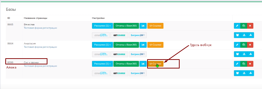 Когда вставляете скопированную ссылку - вебхук в поле Url, отличительный признак ссылки - вебхук на передачу оплат в ссылке написано PAYMENTS, также в ссылке видно номер базы откуда она, в нашем примере номер 8399, означает что ссылка принадлежит базе Алены и ее порядковый номер в разделе Базы - 8399