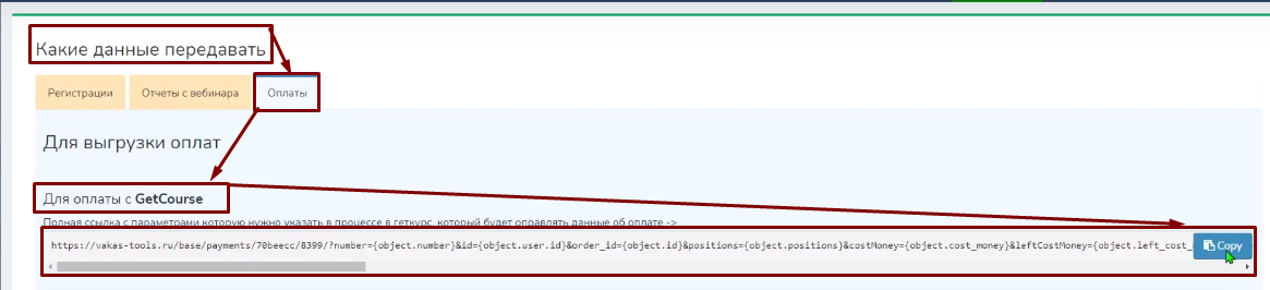 Из этого раздела нужно скопировать ссылку для передачи оплат с GetCourse (можете выделить и скопировать правой кнопкой мыши или нажать на кнопку Copy на голубом фоне).