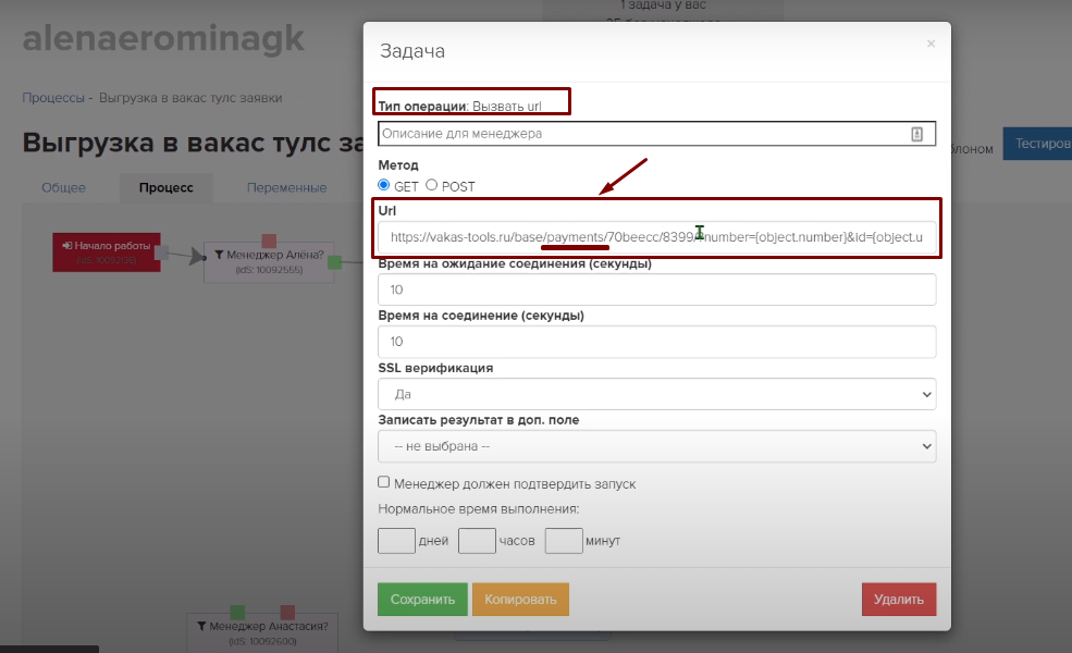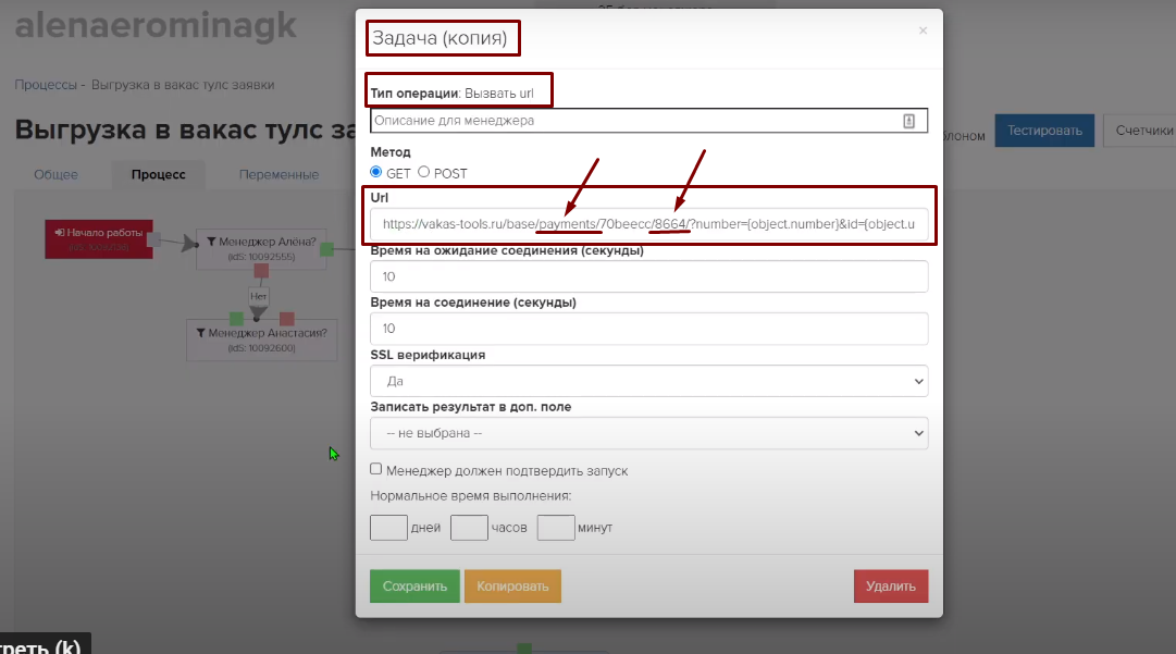 - Операция вызов URL - из этого блока будем отправлять данные по API в базу конкретного менеджера;