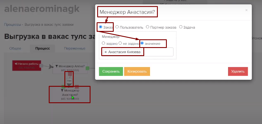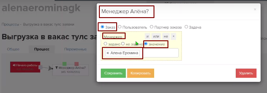 Является ли Алена менеджером в заказе. Для этого выбираете Заказ, далее добавляете условие выбора Менеджер, выбираете значение в нашем случае Алену, у вас же будет выбор из ваших менеджеров. Нажимаете [Сохранить].
