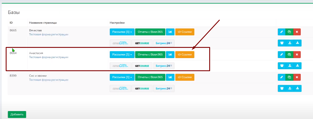 Чтобы ускорить процесс вы можете создать первую Базу, настроить ее, а затем скопировать столько сколько у вас будет менеджеров, настройки Базы копируются вместе с базой. Чтобы скопировать, нужно просто нажать на кнопку [Копировать] (2 листочка справа от базы, на зеленом фоне).