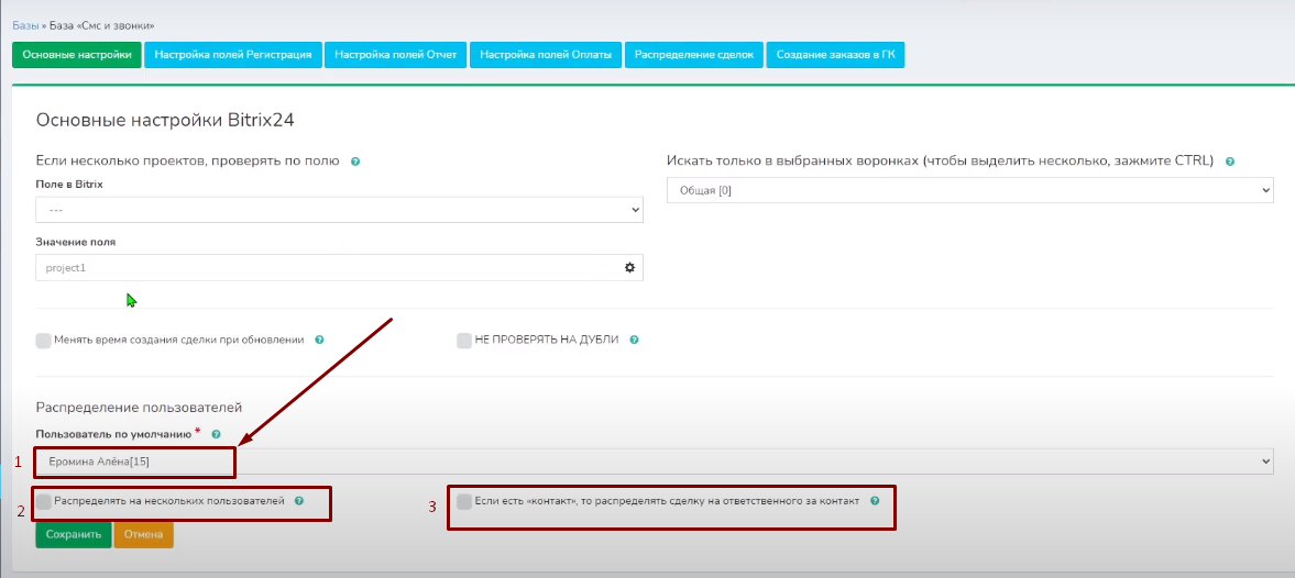 По умолчанию все данные которые будут передаваться через эту базу: регистрации, отчеты и оплаты, будут распределяться на этого ответственного менеджера. Одна база - один ответственный менеджер. Аналогично настраиваете и другие базы, с другими менеджерами.