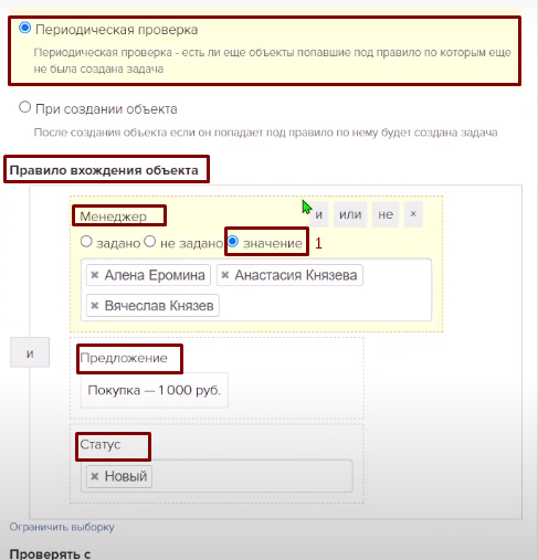 Правило вхождения объекта - Менеджеры, предложение, статус;