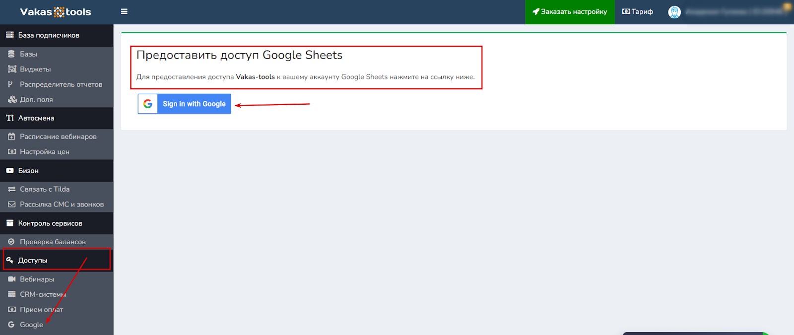 1. Слева в меню выберите «Доступы» - «Google». Нажмите на «Sign in with Google».