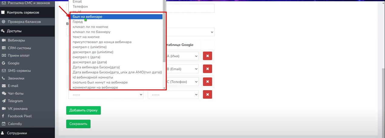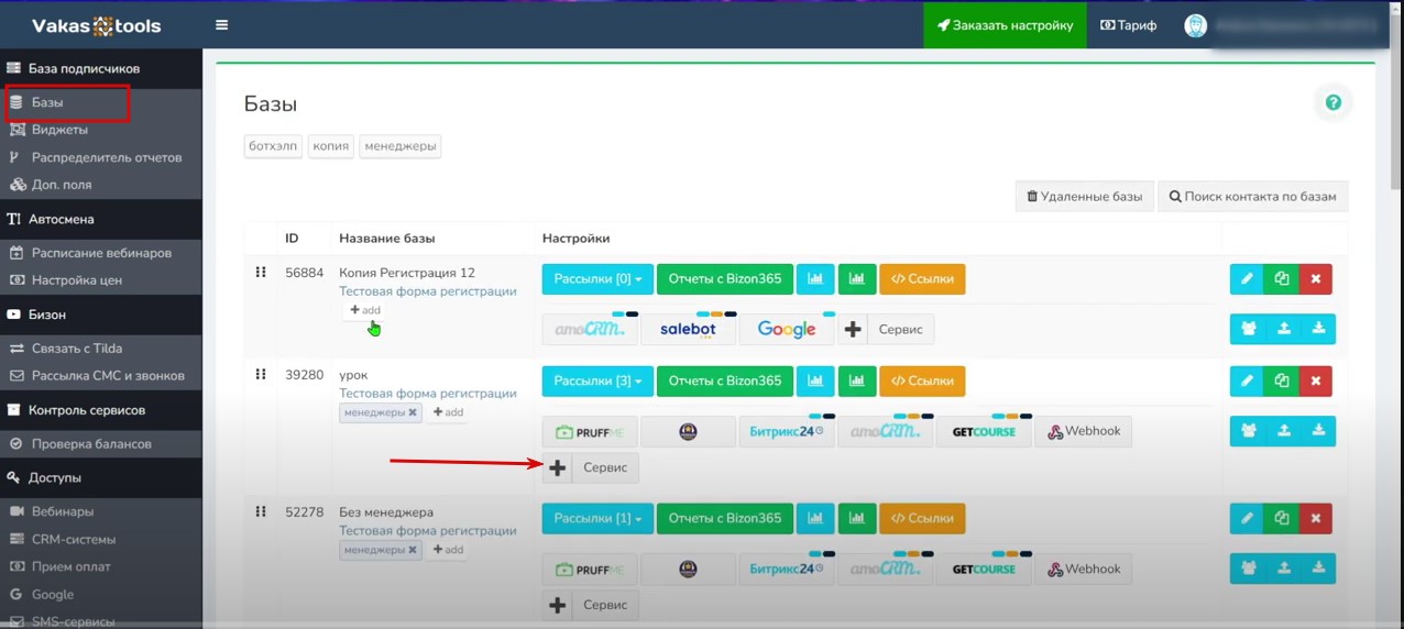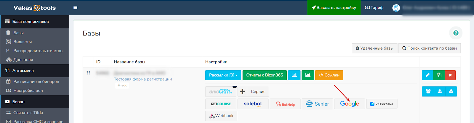 В меню слева выберите «Базы». У нужной Базы нажмите на знак + Сервис, в перечне сервисов (после успешного подключения аккаунта Google) появится возможность выбрать подключение Google.