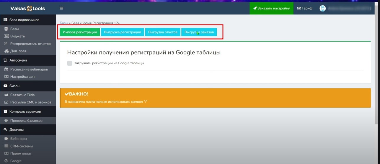 1. Для выгрузки регистраций вкладка - Выгрузка регистраций (из Базы Vakas-tools в Google таблицу)