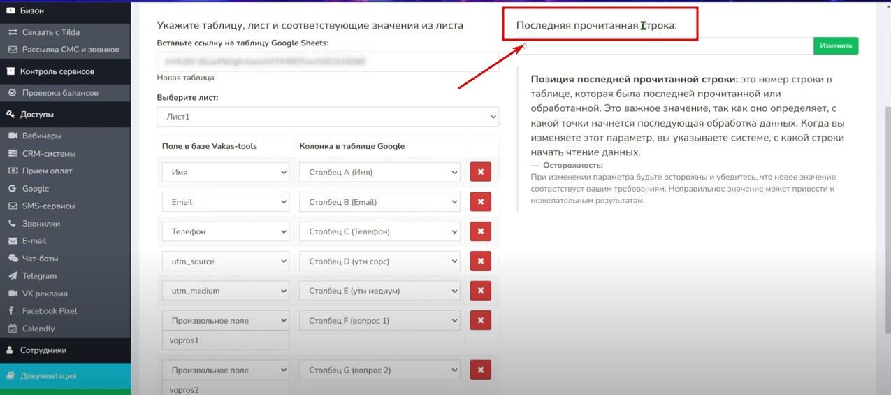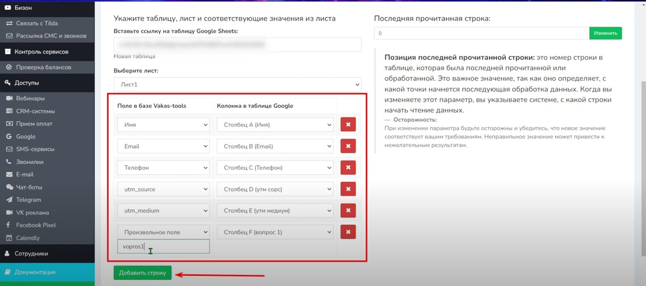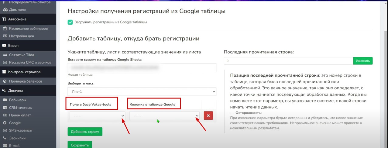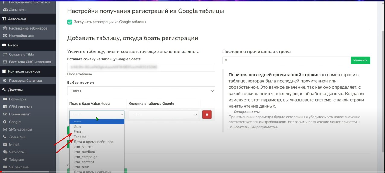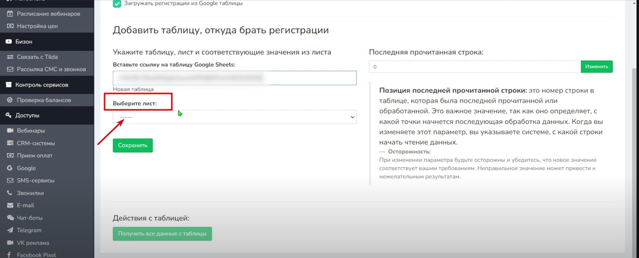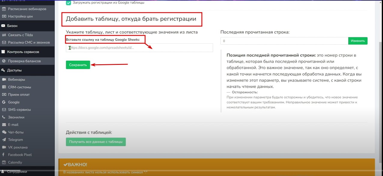 Для добавления таблицы, откуда брать регистрации, необходимо вставить ссылку на таблицу Google Sheets.