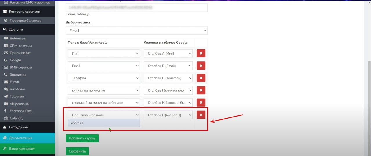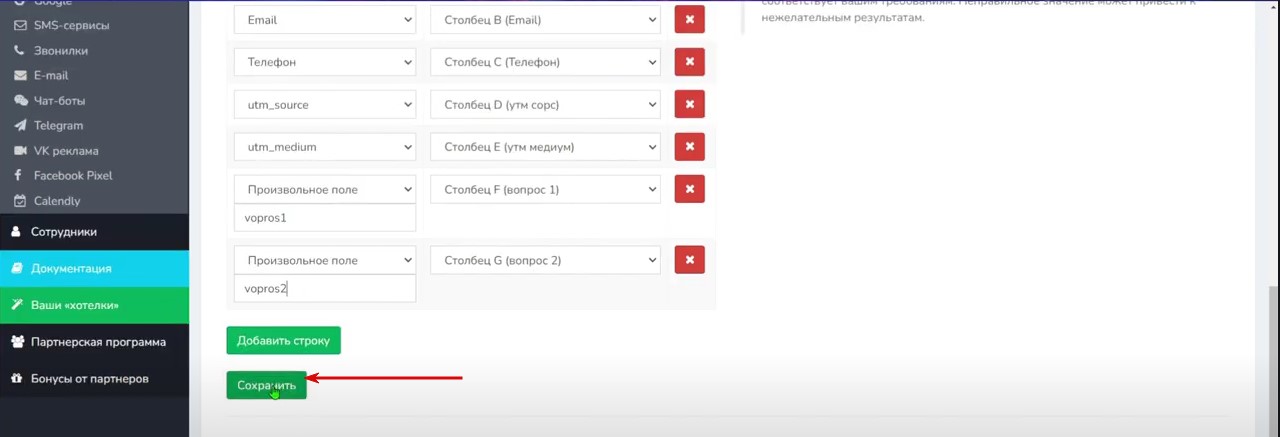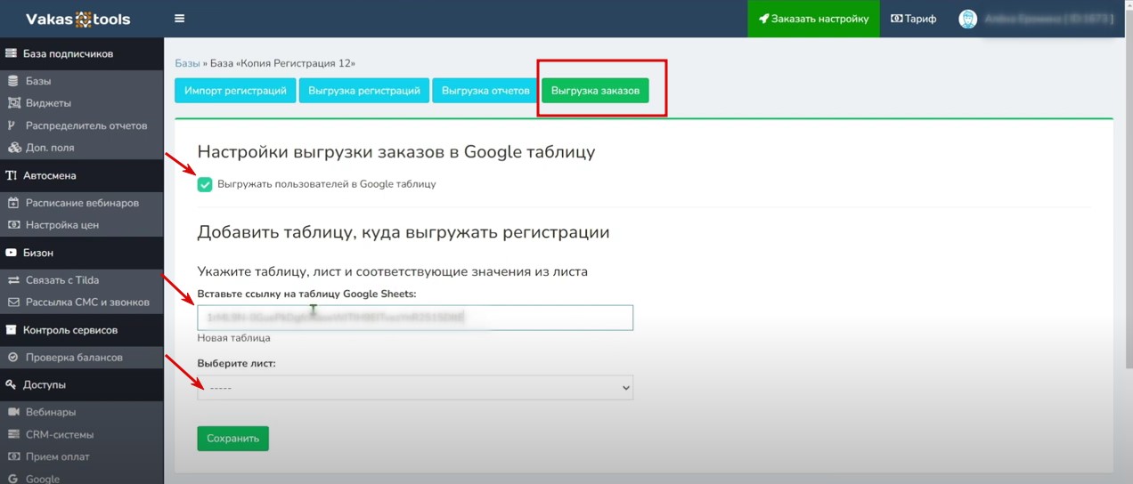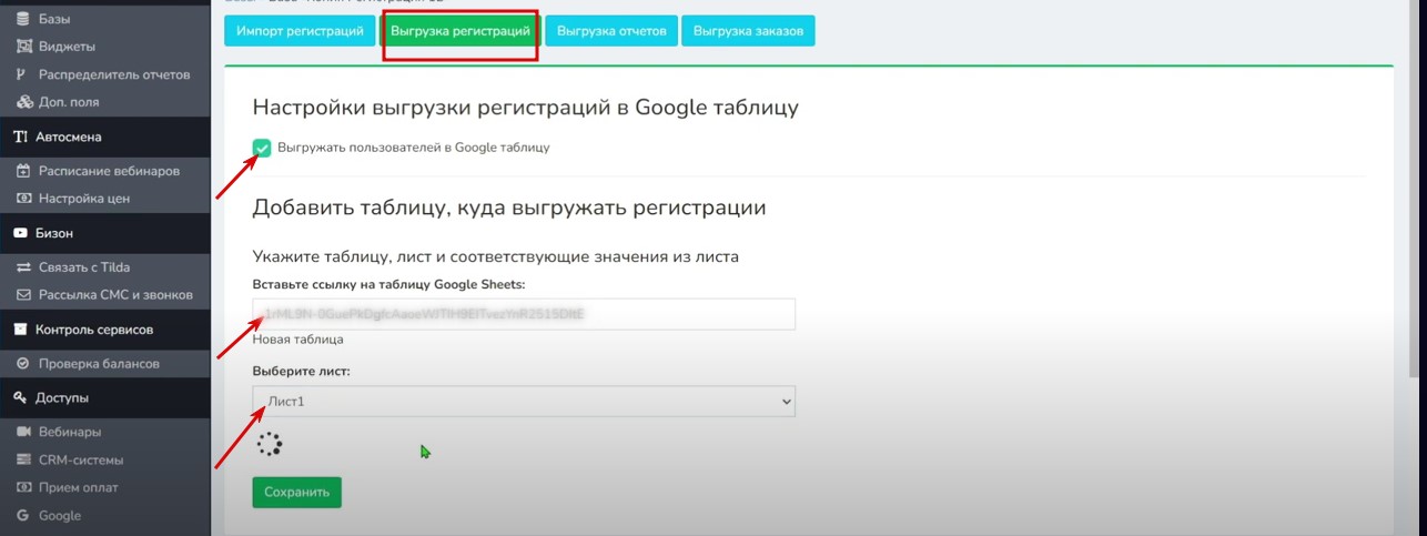 1. Ставим галочку Выгружать пользователей в Google таблицу;