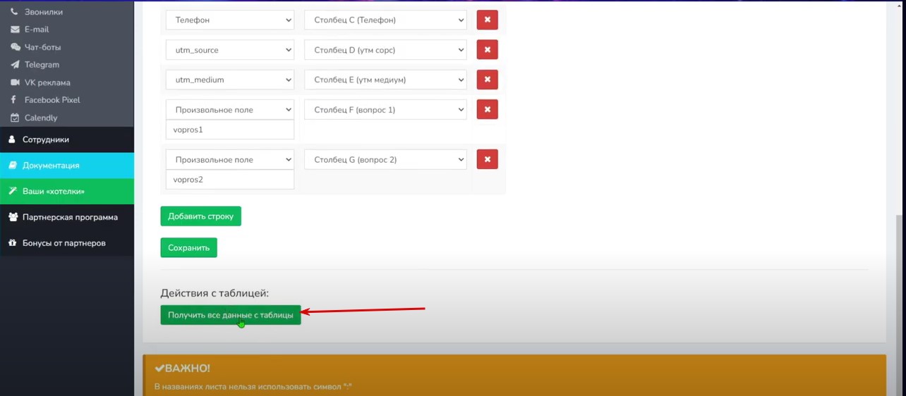 ВАЖНО! Выгрузка из таблиц может происходить с задержкой до 30 минут. Ранее не следует нажимать никакие кнопки в настройках для выгрузки.