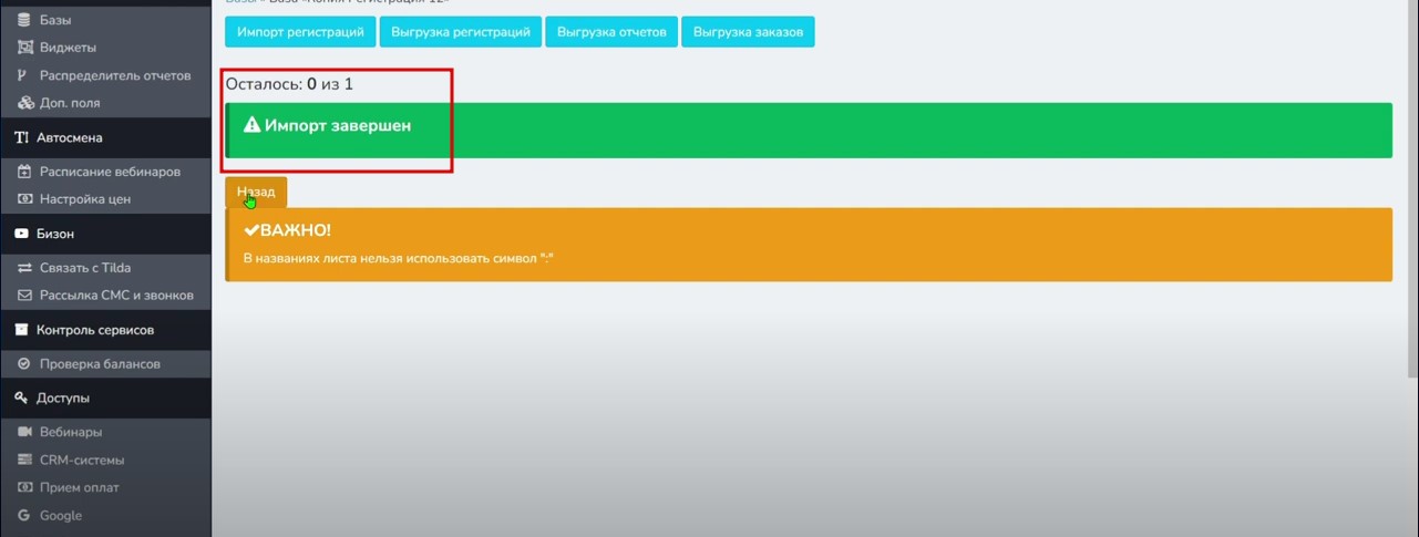 - Перед настройкой выгрузки регистраций, отчетов или заказов необходимо предварительно настроить получение данных в ту же базу из Tilda, Bizon, Getcourse или других сервисов.