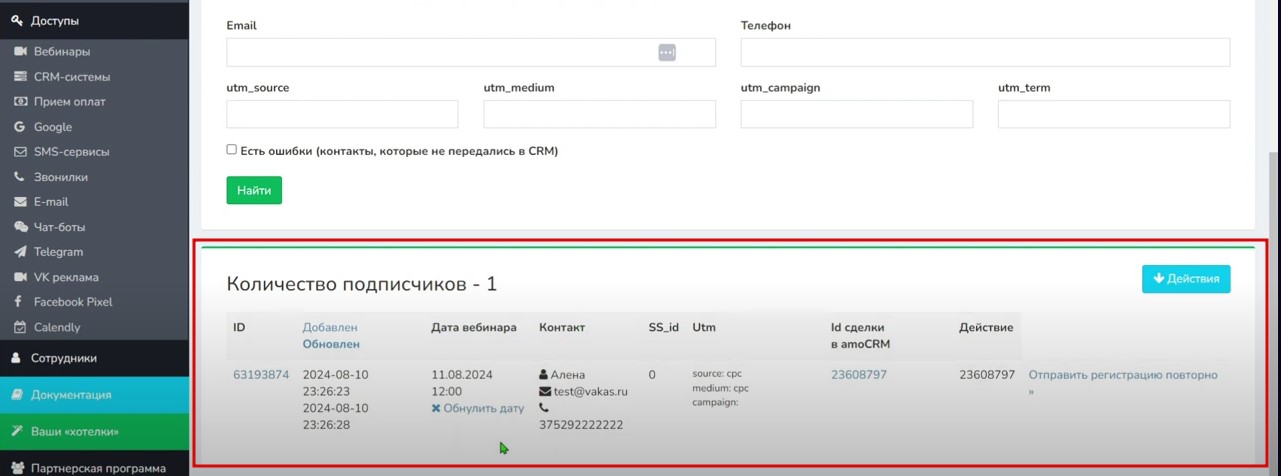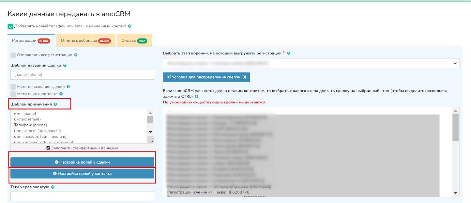 - Обязательно настройте передачу контактов (имя, email, телефон), иначе выгруженные данные будет невозможно использовать.