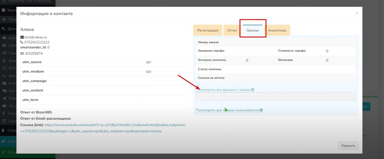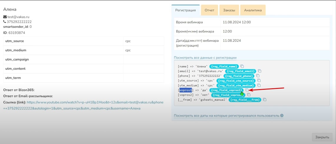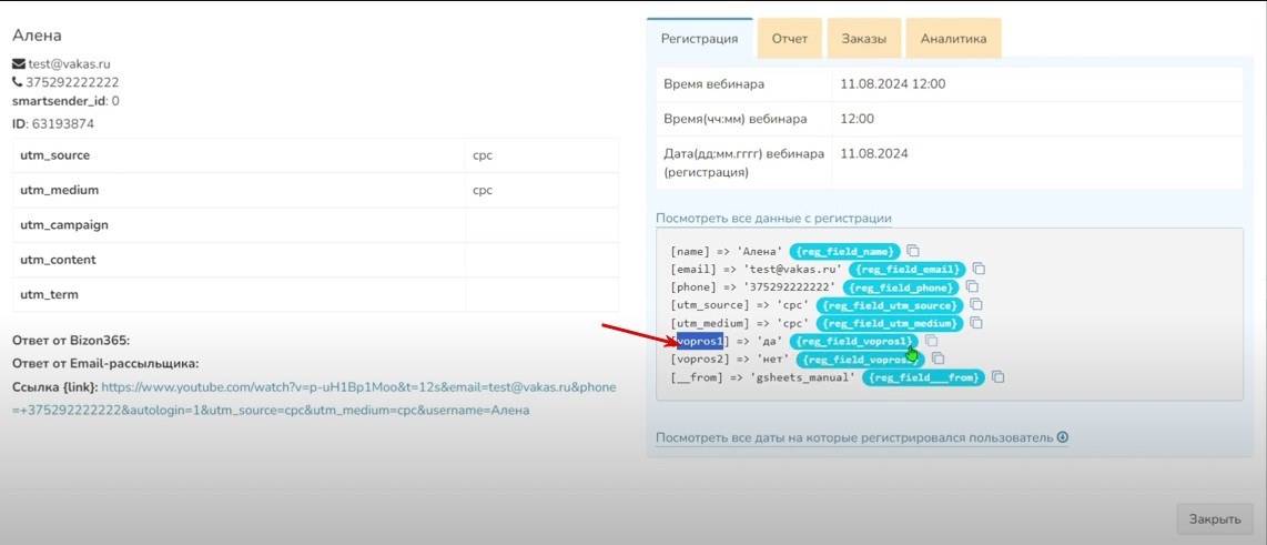 Значение переменной для произвольного поля берем из карточки подписчика, кликнув на его id, из вкладки Заказы, копируем из квадратных скобок только имя переменной, например, как в настройках выше, vopros1.