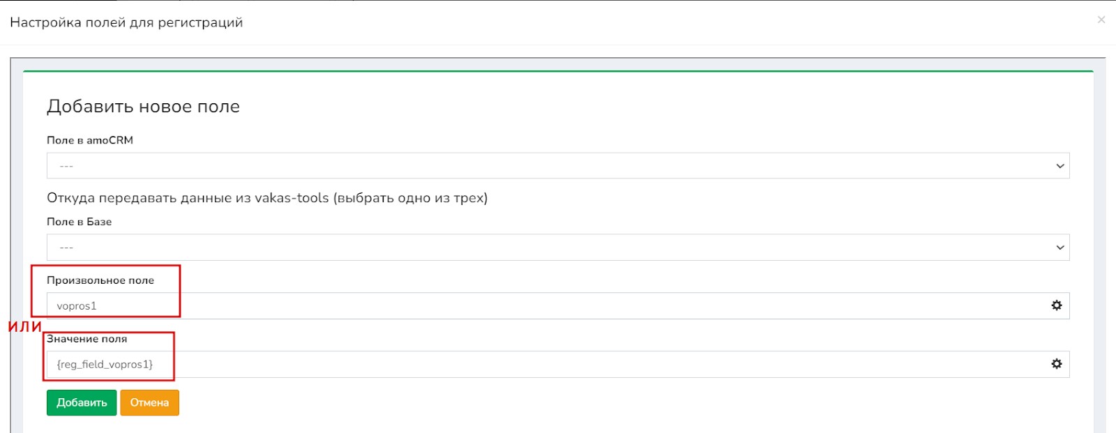 для передачи переменных, которые записали в Произвольное поле, в нашем примере это vopros1 и vopros2, далее в CRM, для Примечания и Значения поля используйте шорткод (выделен заливкой, есть значок копирования у него), а для Произвольного поля просто имя переменной, без скобок и прочего.