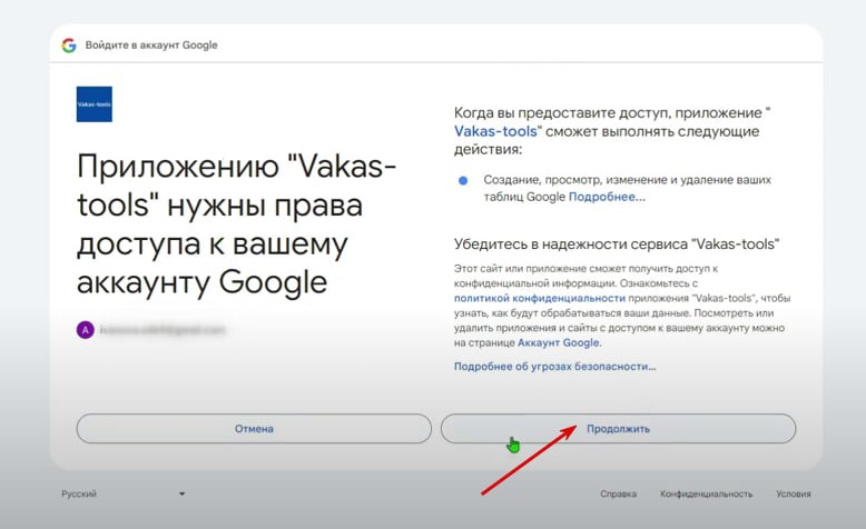 3. Для предоставления прав доступа Vakas-tools к нужному аккаунту Google нажмите «Продолжить».