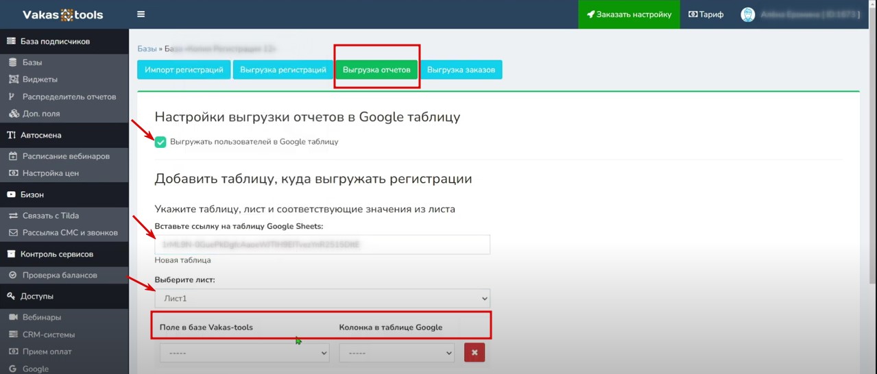2. Для выгрузки отчетов вкладка - Выгрузка отчетов (из Базы Vakas-tools в Google таблицу).