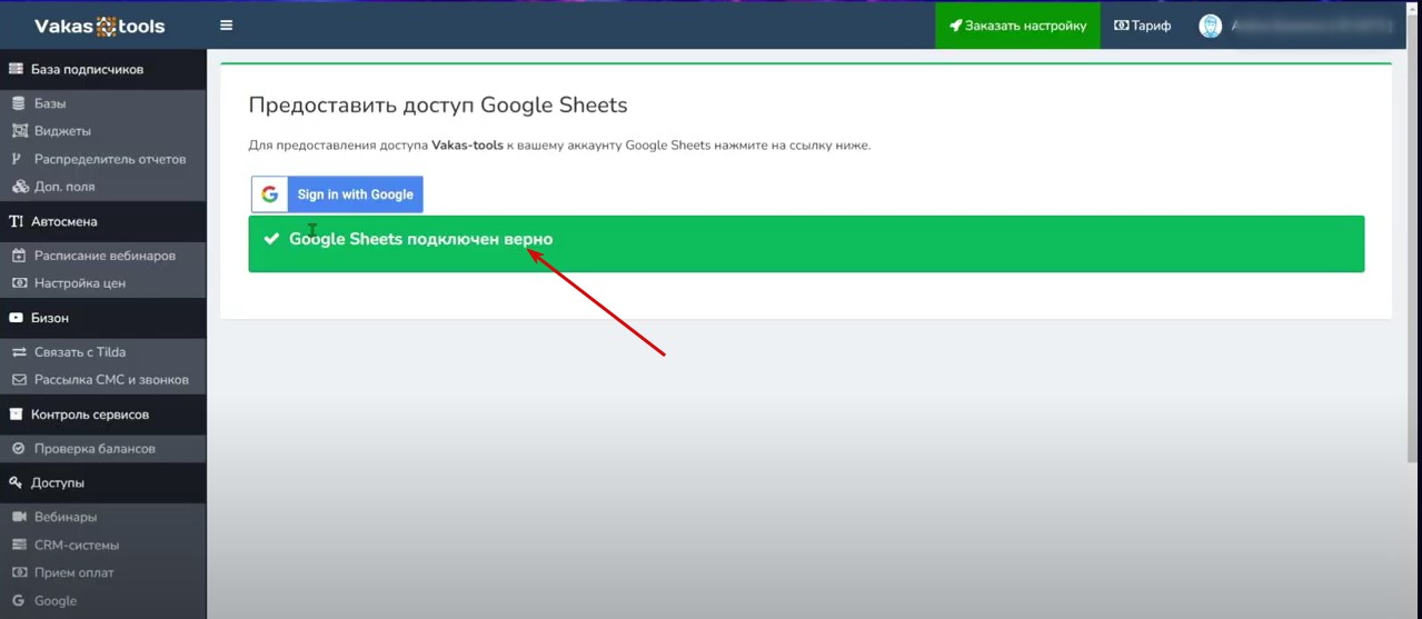 4. После данных действий появится сообщение: Google Sheets подключен верно.