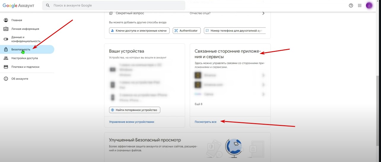 Слева в меню выберите «Безопасность» - «Связанные сторонние приложения и сервисы» - “Посмотреть все”.