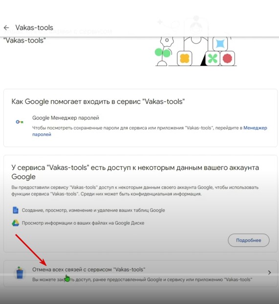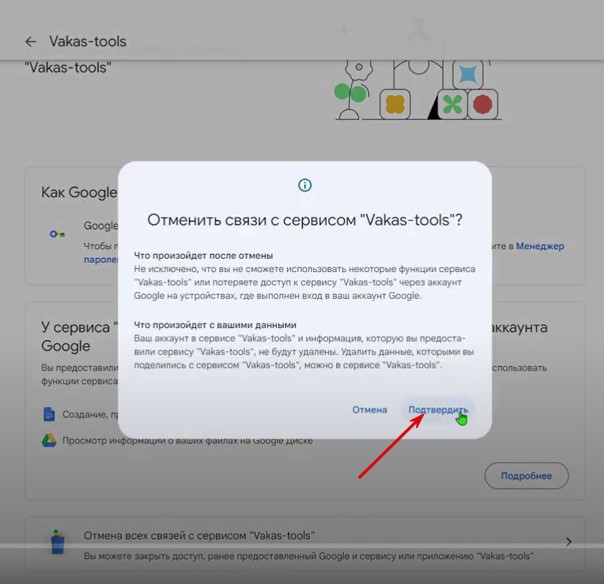 3. Нажмите на кнопочку «Отмена всех связей с сервисом Vakas-tools» и далее “Подтвердить”.