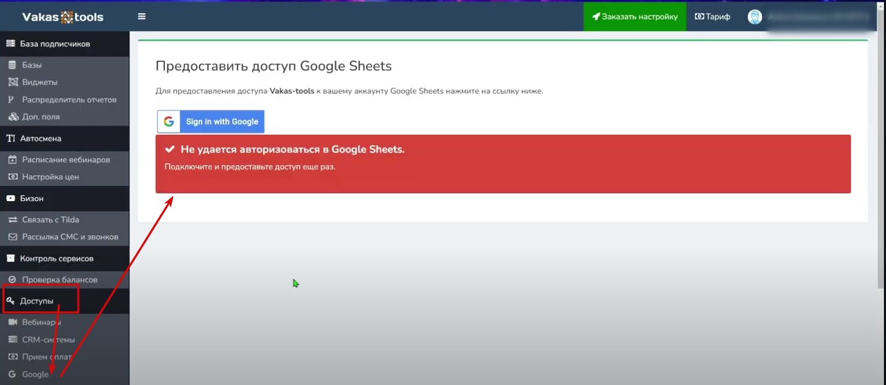 4. После выполнения данных действий перейдите в сервис Vakas-tools - Доступы- Google и там появится красная плашка с надписью “Не удается авторизоваться в Google Sheets”. Связь сервиса Vakas-tools с аккаунтом Google отключена.