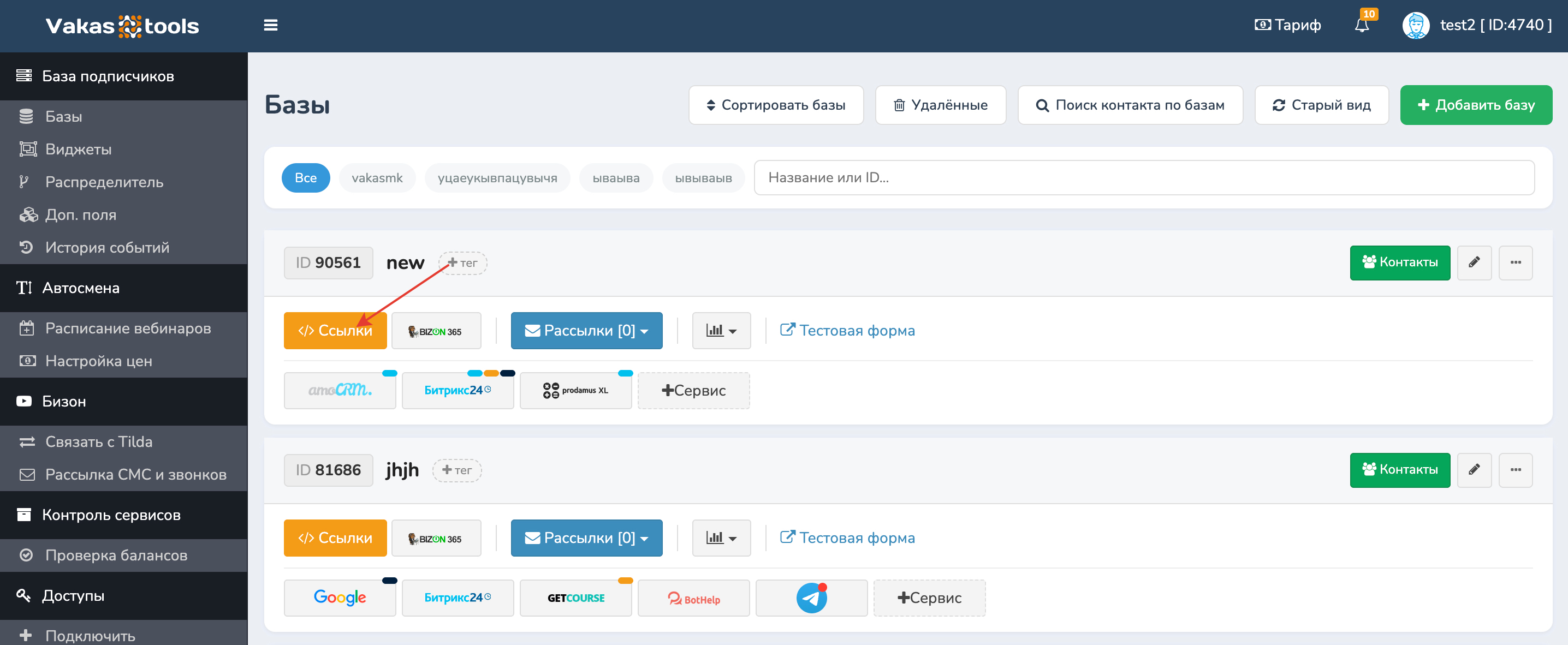 1. В Vakas-tools в базе, в которую будут собираться регистрации, нажмите на «Ссылки».