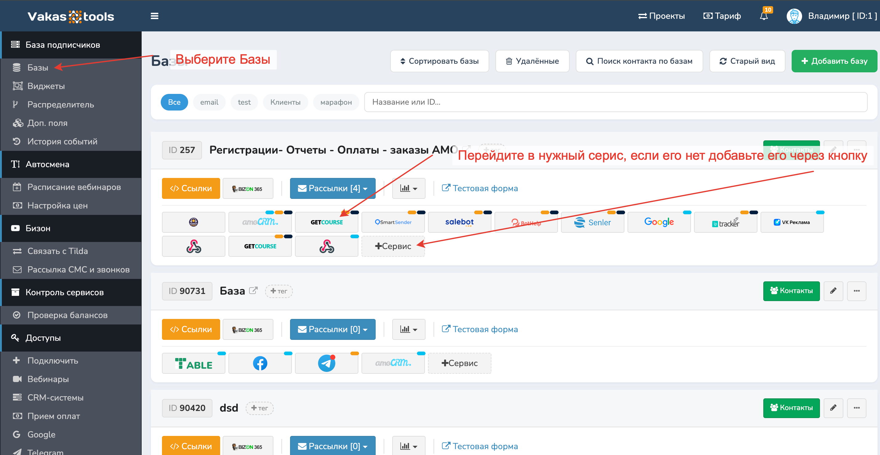ВАЖНО! Предварительно должна быть настроена передача регистраций, отчетов, заказов и оплат из сервисов, таких как Bizon 365, Tilda, Getcourse и других, в базу в Vakas-tools.