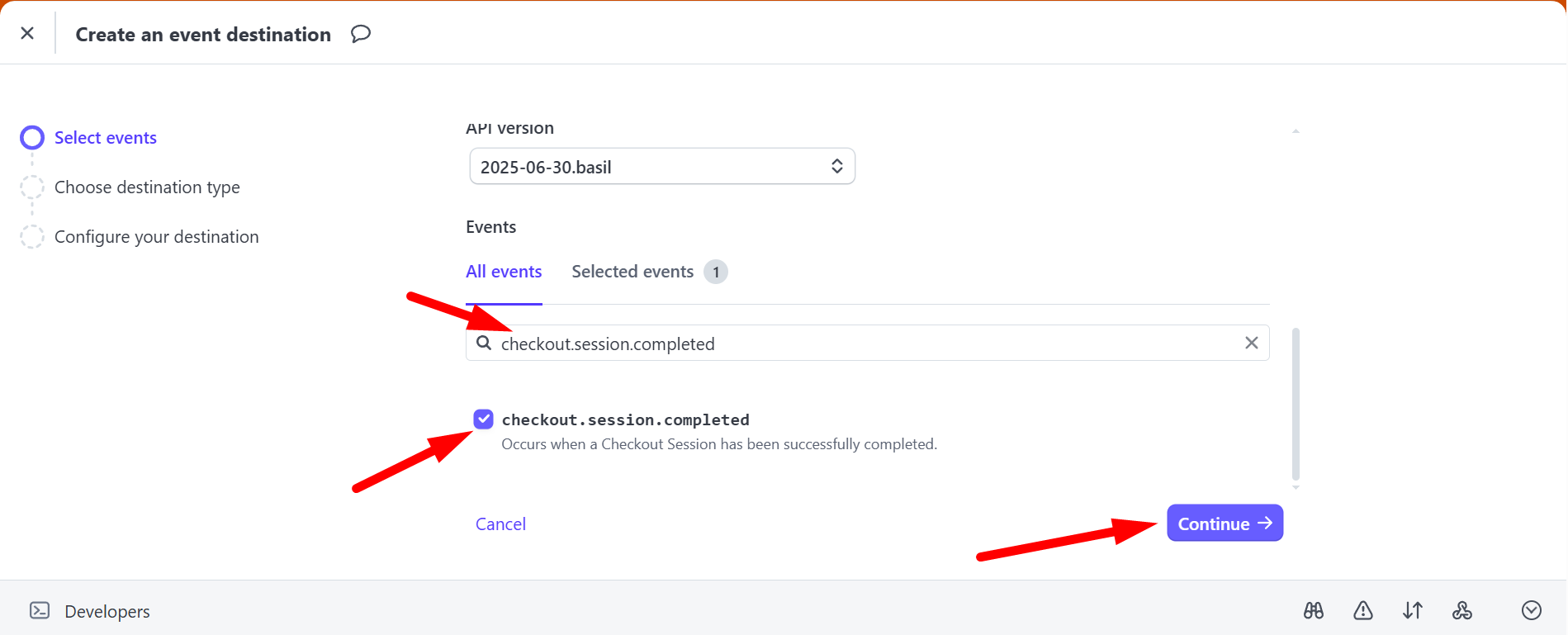 Шаг 3. Найдите и отметьте галочкой событие checkout.session.completed