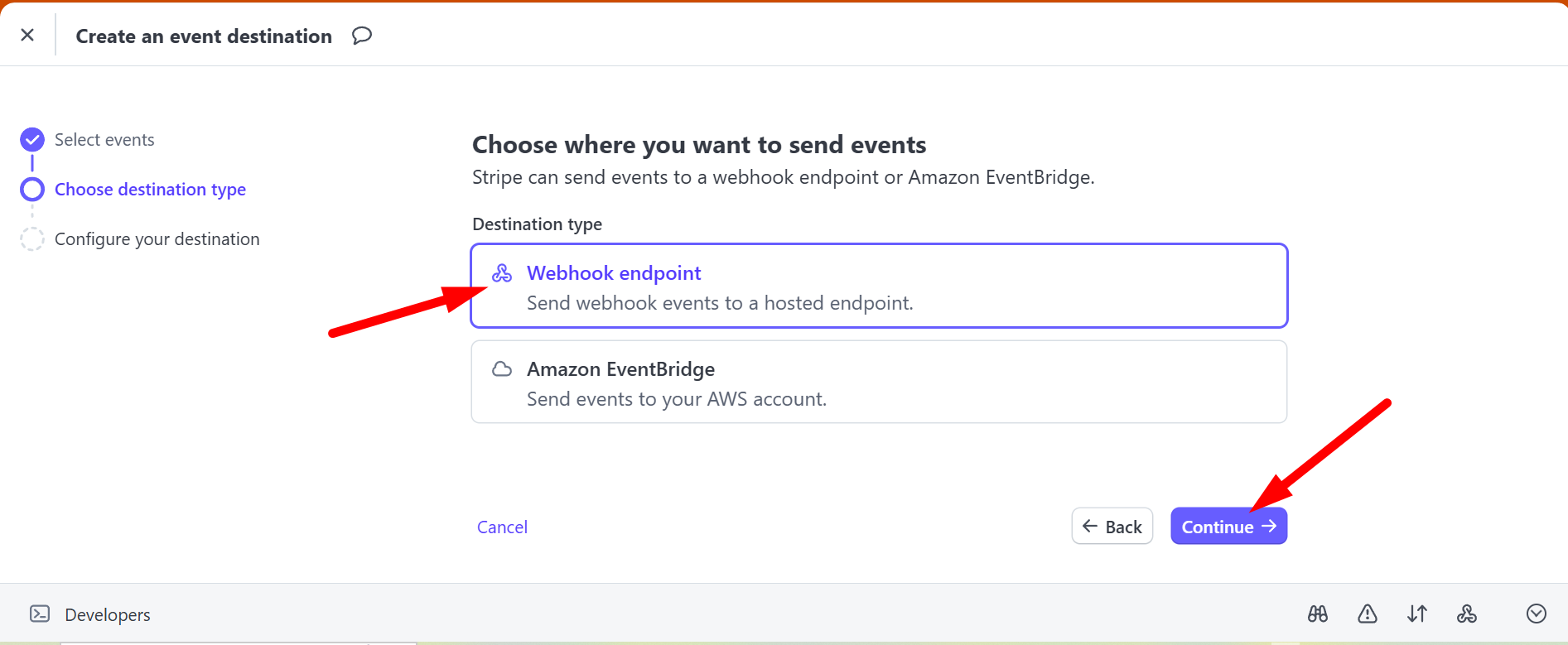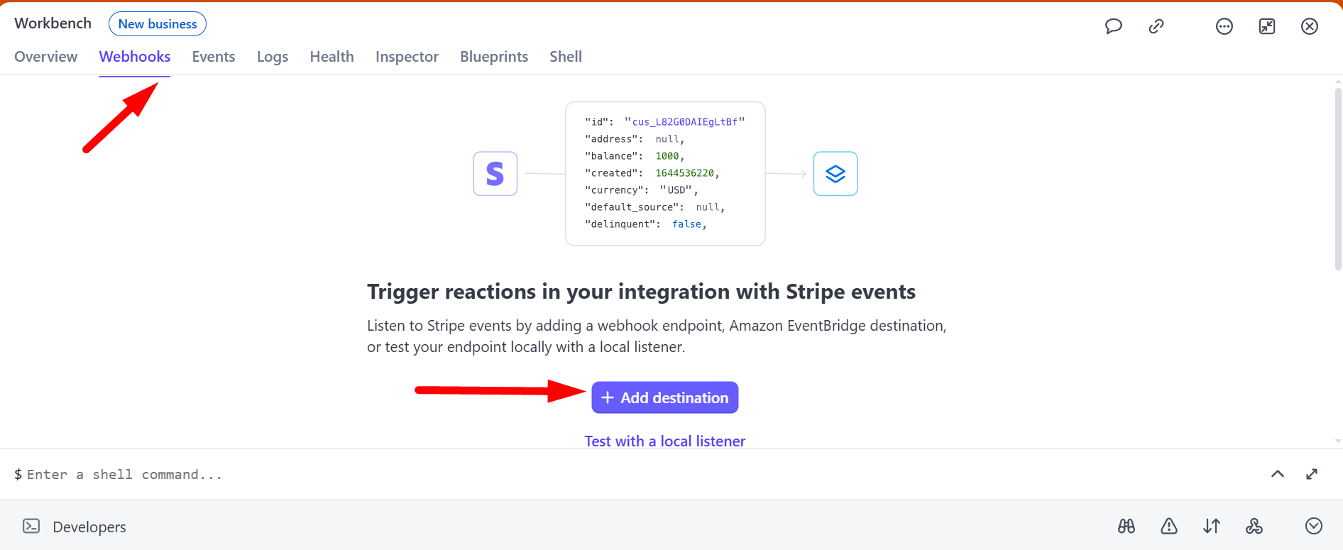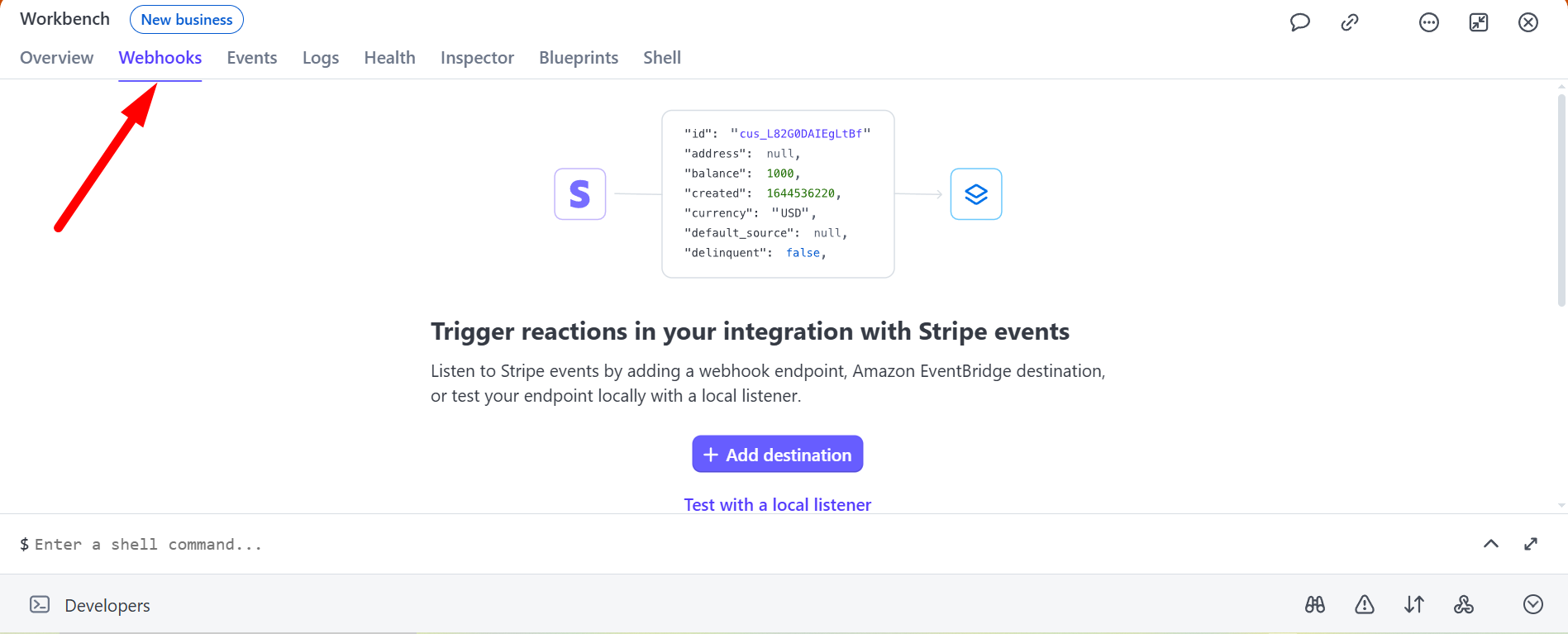 Шаг 1. В личном кабинете Stripe, в разделе Developers перейди во вкладку Webhooks.