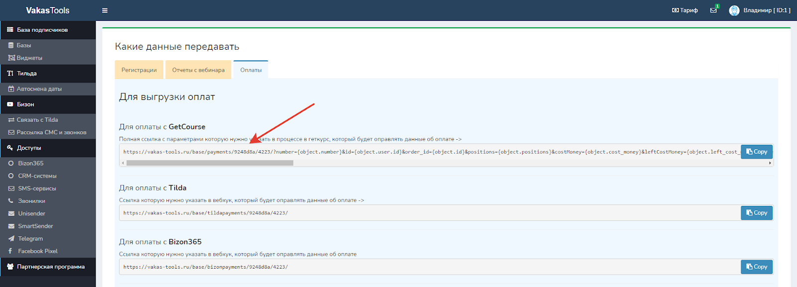 Переходим на вкладку Оплаты и копируем ссылку для оплаты в Getcourse.