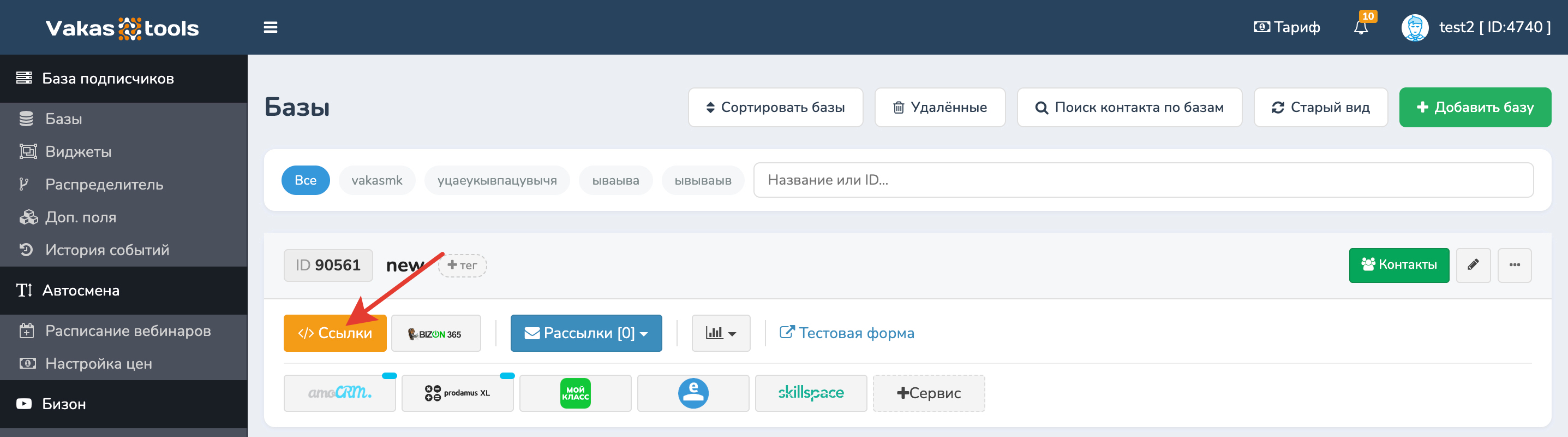 Нажимаем кнопку [Ссылки] у нужной Базы.
