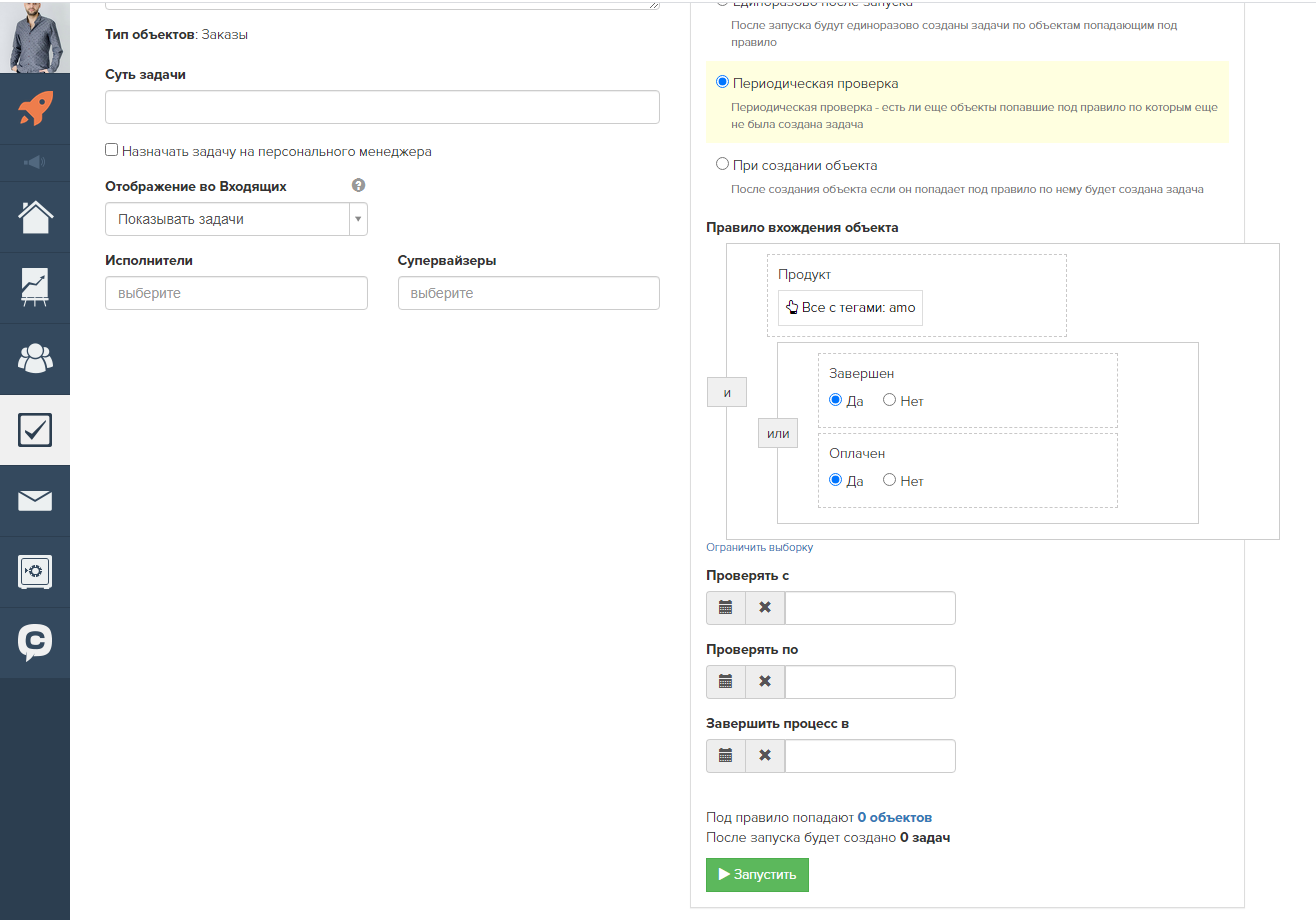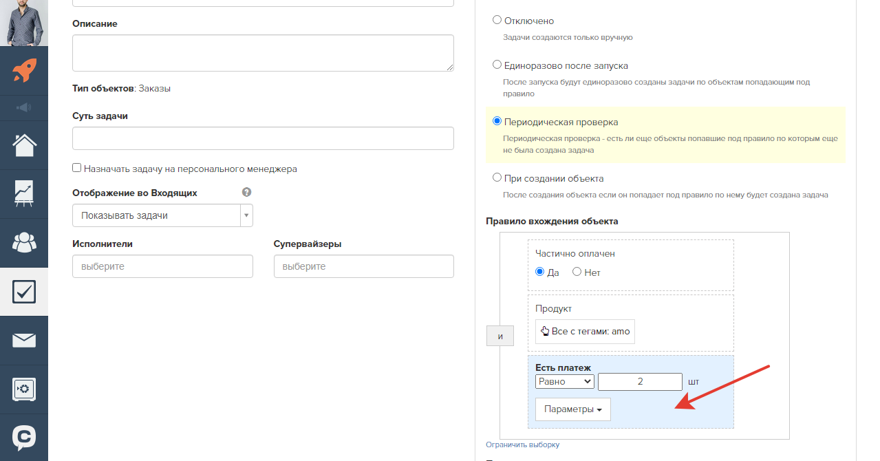 Массовое создание задач: Периодическая проверка. Правило вхождения объекта (условие): Частично оплачен. На примере: Все Продукты с тегами amo попадут в процесс. Дополнительно можно добавить и другие условия.